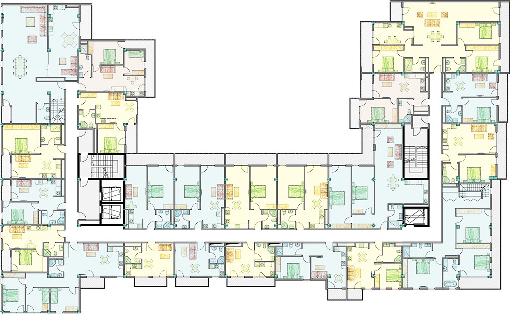 The outer and inner walls of the apartment buildings are constructed with energy-efficient YTONG building blocks. Walls built with this material keeps consistent room temperature and provides sound insulation.