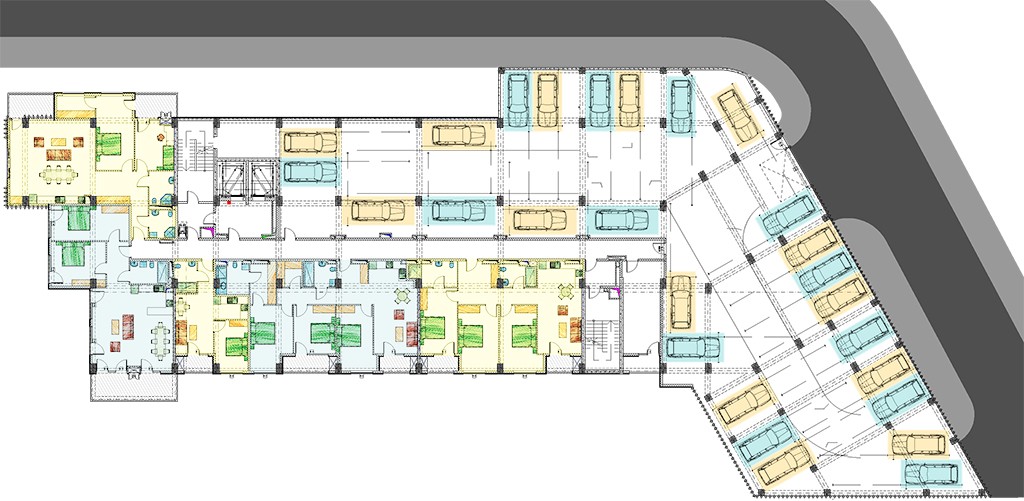 "White Square on Mindeli Street" unites a total of 6 residential buildings and includes: two 14-storey buildings, one 15-storey building and three 22-storey buildings. Each residential building has more than 100 residential apartments and various types of commercial or office space.