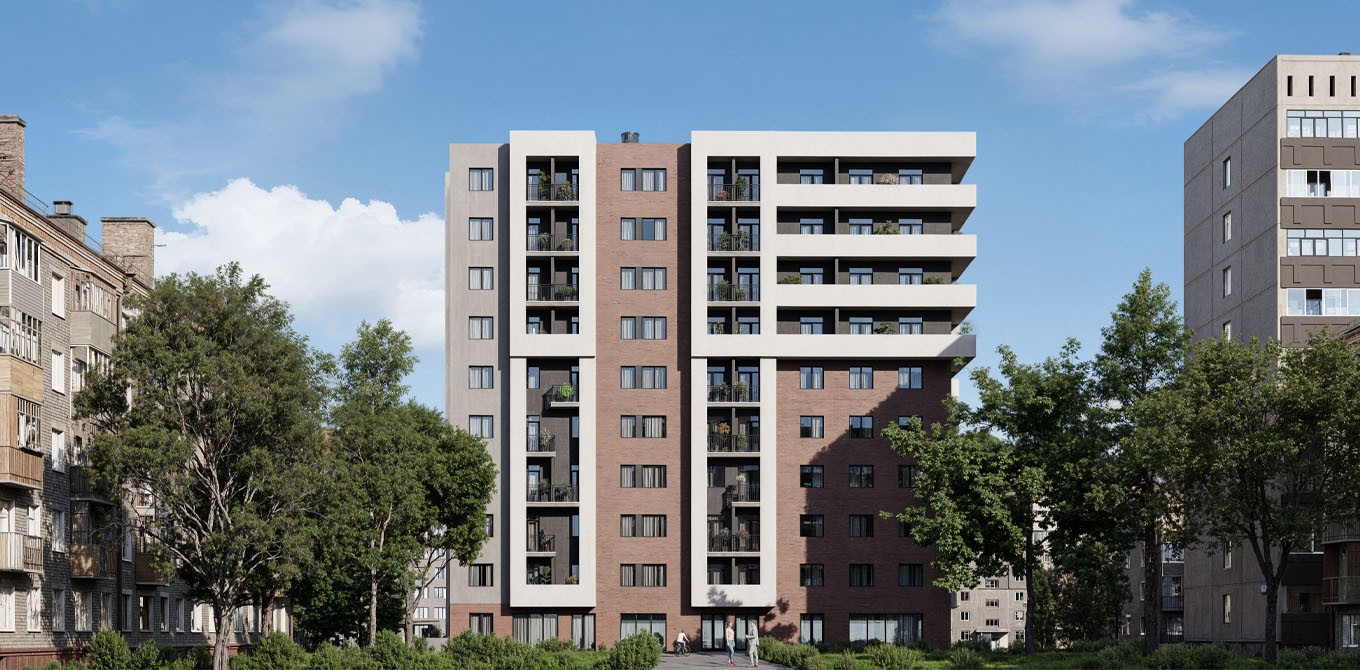 This 10-storey building includes a total of 129 residential apartments, parking spaces, and commercial premises. Apartment sizes start from a minimum of 35.1 sq.m.