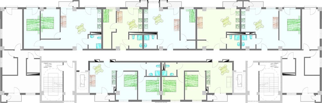 ბინები სხვადასხვა საჭიროებებზეა მორგებული:  ახალი, დიდი და პატარა ოჯახებისთვის, გასაქირავებლად თუ სტუდენტებისთვის.ახალი კორპუსი 10 სართულიანია, ადაპტირებული და აღჭურვილი სახანძრო სისტემებით.